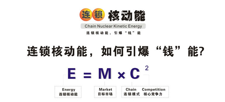 ,這是世界著名的愛(ài)因斯坦能量公式。基于愛(ài)因斯坦的相對(duì)論和能量公式,產(chǎn)生了原子彈和核電站,今天的人類太空實(shí)踐證實(shí)了愛(ài)因斯坦理論的正確性,人類因此發(fā)生了翻天覆地的變化。在愛(ài)因斯坦的能量公式中,M是質(zhì)量,C是光速,當(dāng)速度為光速時(shí),即使很小的質(zhì)量也能轉(zhuǎn)化為非常大的能量。 廣州采納企業(yè)管理顧問(wèn)有限公司首席咨詢師陳宏創(chuàng)建的的連鎖核動(dòng)能理論(全名:連鎖內(nèi)核能量裂變激增理論)是以愛(ài)因斯坦的能量公式為基礎(chǔ)創(chuàng)建,但其含義和指向是不同的:M=目標(biāo)市場(chǎng)(Market),C1=連鎖模式(Chain),C2 =核心競(jìng)爭(zhēng)力(Competition),其理論意義是,企業(yè)找準(zhǔn)了目標(biāo)市場(chǎng),以連鎖的方式經(jīng)營(yíng),核心競(jìng)爭(zhēng)力越大,推動(dòng)其發(fā)展能量就越大。 連鎖核動(dòng)能理論如何幫助連鎖企業(yè)“引爆錢(qián)能”快速發(fā)展?我們用深入淺出的圖形表達(dá)方式對(duì)該理論進(jìn)行分層闡述: